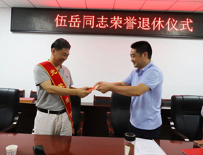 儀式上,董事長(zhǎng)陽文林為伍岳同志佩戴了“光榮退休”綬帶,頒發(fā)了“光榮退休”紀(jì)念牌,并代表集團(tuán)公司向伍岳同志為萬寶投各項(xiàng)事業(yè)發(fā)展所作出的貢獻(xiàn)表示崇高的敬意和衷心的感謝?偨(jīng)理徐業(yè)波傳達(dá)了相關(guān)文件精神,介紹了退休同志有關(guān)情況,回憶曾經(jīng)與伍岳同志共同奮斗的情誼和榮耀。工會(huì)代表在座談會(huì)上表達(dá)了感恩與不舍的心情,并送上了溫馨的祝福。