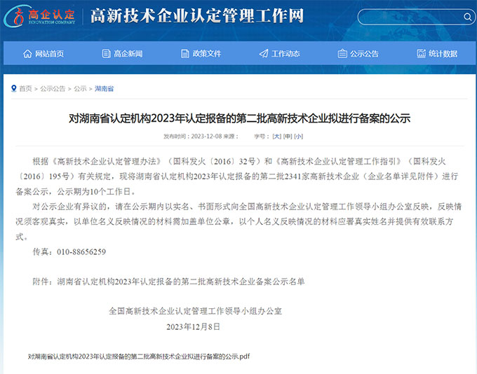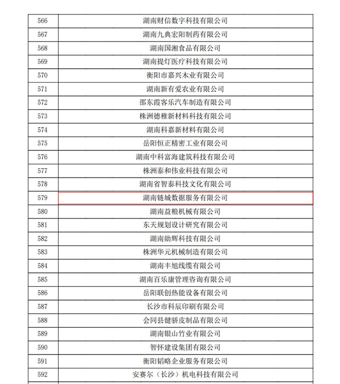 2023年12月,湖南省認定機構(gòu)2023年認定報備的第二批高新技術(shù)企業(yè)備案名單公示,湖南鏈城數(shù)據(jù)服務有限公司赫然在列,公司申報國家級高新技術(shù)企業(yè)獲批通過。